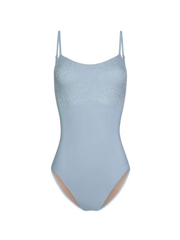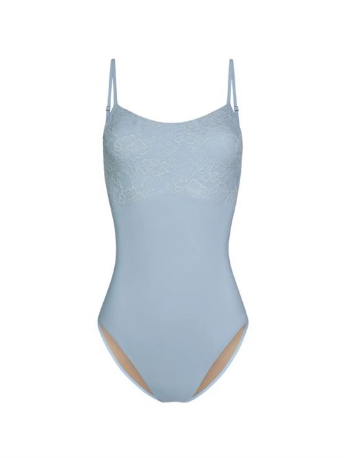 Chloe balletdragt fra Mara Dancewear i en duset himmelblå nuance med fine blonder med blomsterdetaljer på busten og ryggen, hvilket skaber en yndefuld silhuet.