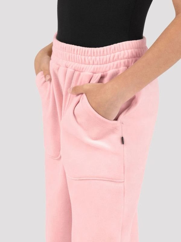 Fremstillet i blød velour, giver de en luksuriøs følelse samtidig med fuld bevægelsesfrihed under ballettræning. Bukserne har fuldlange ben med elastik ved anklerne, en høj, rynket talje med snøre, og praktiske dobbelte frontlommer – perfekt til at holde småting på plads eller varme hænderne.