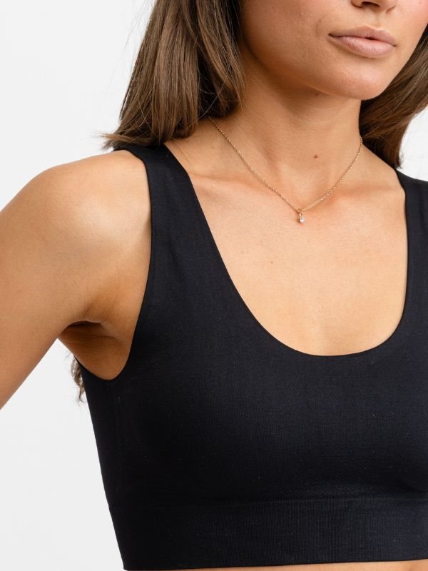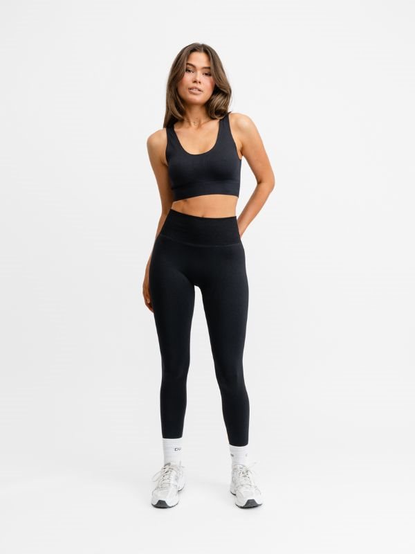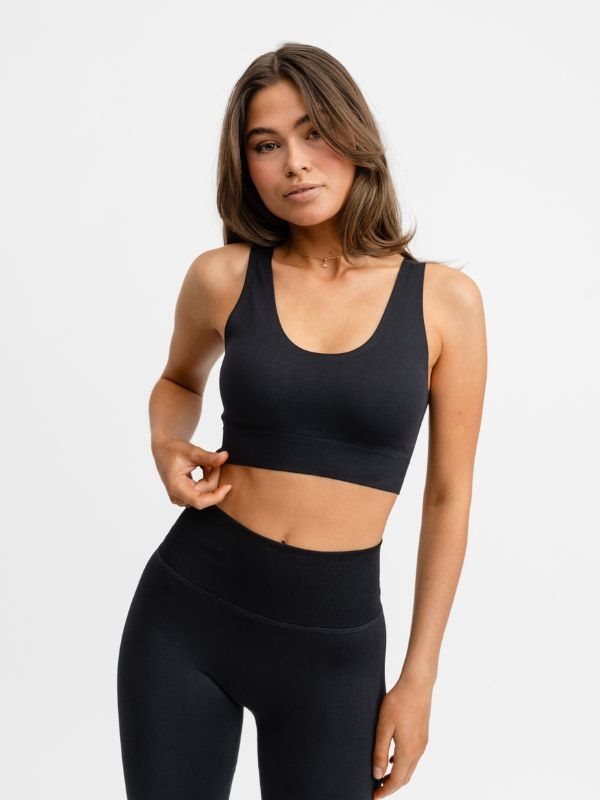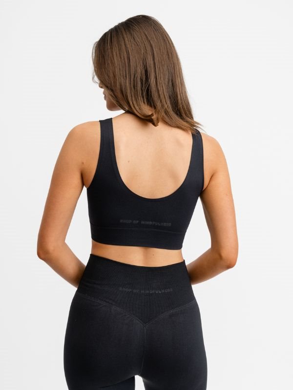Drop of Mindfulness sort Flow sømløs top er en blød, komfortabel sports-bh'er med aftagelige indlæg. Designet med bredere stropper og minimale sømme for et æstetisk look.
