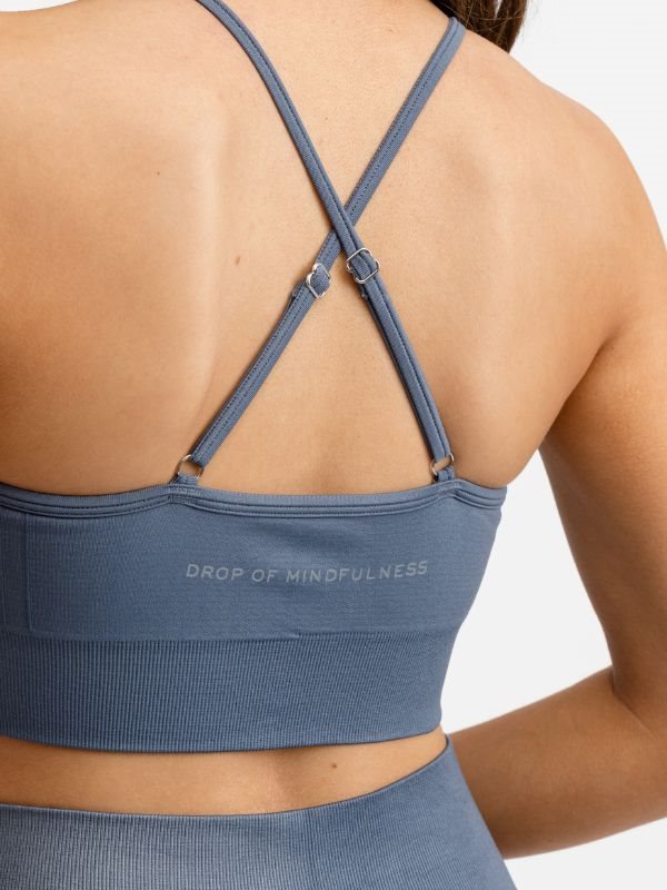 Signature bh top i blå. Skøn top med justerbare stropper der krydser på ryggen. Den har aftagelige puder og et rib stykke under brystet for bedre støtte og behagelighed.