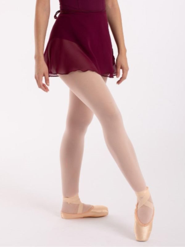 Intermezzo elegant bordeaux slå-om balletskørt i chiffon med bindebånd, der bindes på i ryggen. Fremstillet i 100 % polyester og designet til at give maksimal komfort. Perfekt til dansere på alle niveauer. Match med balletdragt i samme farve.