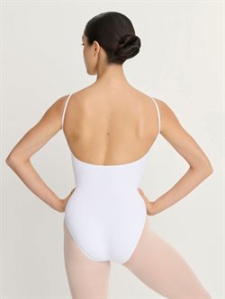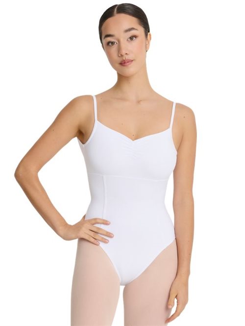 Hvid klassisk balletdragt med tynde stropper, flatterende hjerteformet halsudskæring med rynk og lav ryg. Designet har aftagelige bh-puder (voksenstørrelser) for ekstra komfort samt frontsyninger, der fremhæver silhuetten og sikrer en perfekt, tætsiddende pasform. Elegant, tidløs og skabt til både komfort og performance.