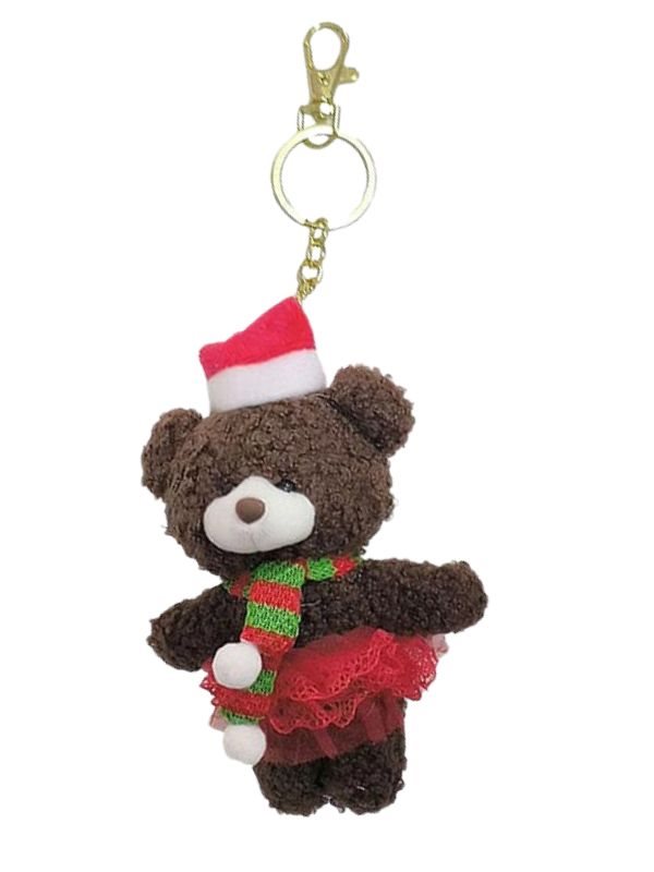 Nøglering med mørkebrun ballerina-bamse i bouclé-uld, iført julehat og rød tutu.