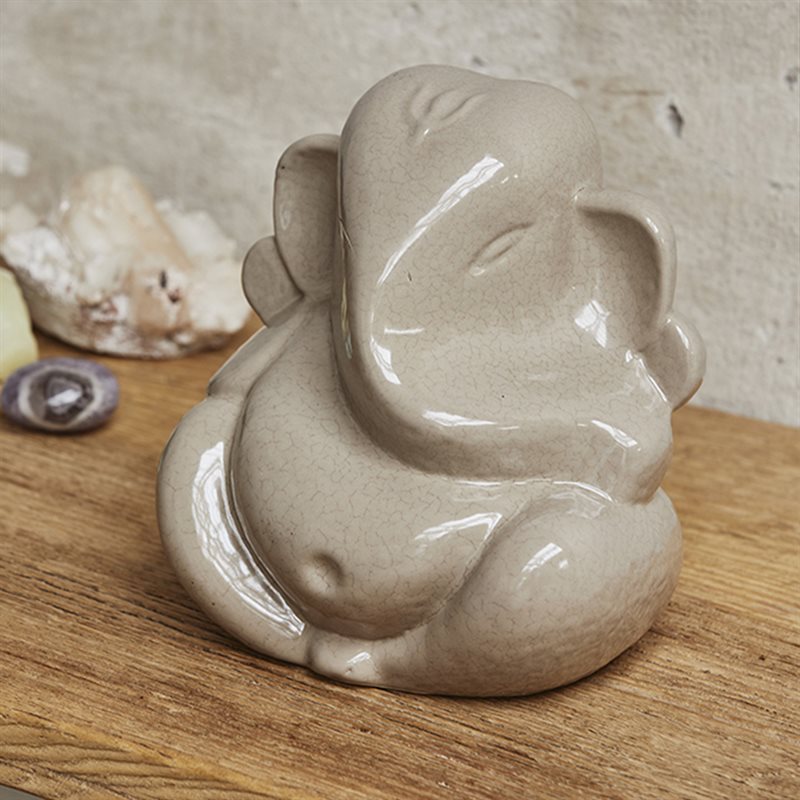GANESHA sød figur i stentøj i beige. En unik håndlavet stentøjsfigur. Hver enkelt er unik med sin krakelerede glasur. Perfekt til at tilføje et strejf af ro og god karma til dit yogastudie eller hjem. Mål: 20 cm høj, 18,5 cm bred, vægt 1,5 kg.