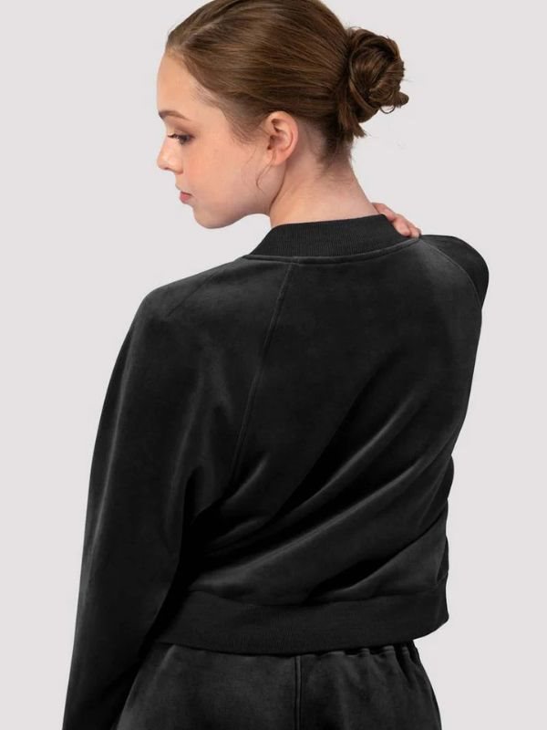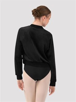Sort velour sweat warmup jakke Bloch. Denne jakke er fremstillet af 95% polyester og 5% elastan, hvilket sikrer fleksibilitet og holdbarhed. Med raglanærmer og ribkant ved manchetter, hals og talje, tilbyder den perfekt pasform og stil. Den elegante lynlåslukning foran fuldender looket. Kombiner den med Gloria sweatpants for et fuldendt og eksklusivt warm-up sæt. Perfekt til opvarmning og afslapning før og efter dans.