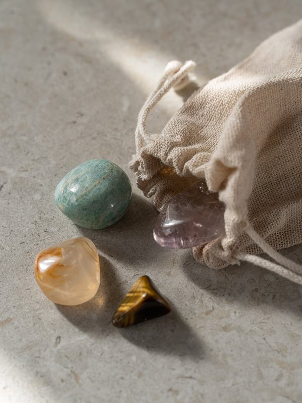 En lille stofpose med følgende sten: